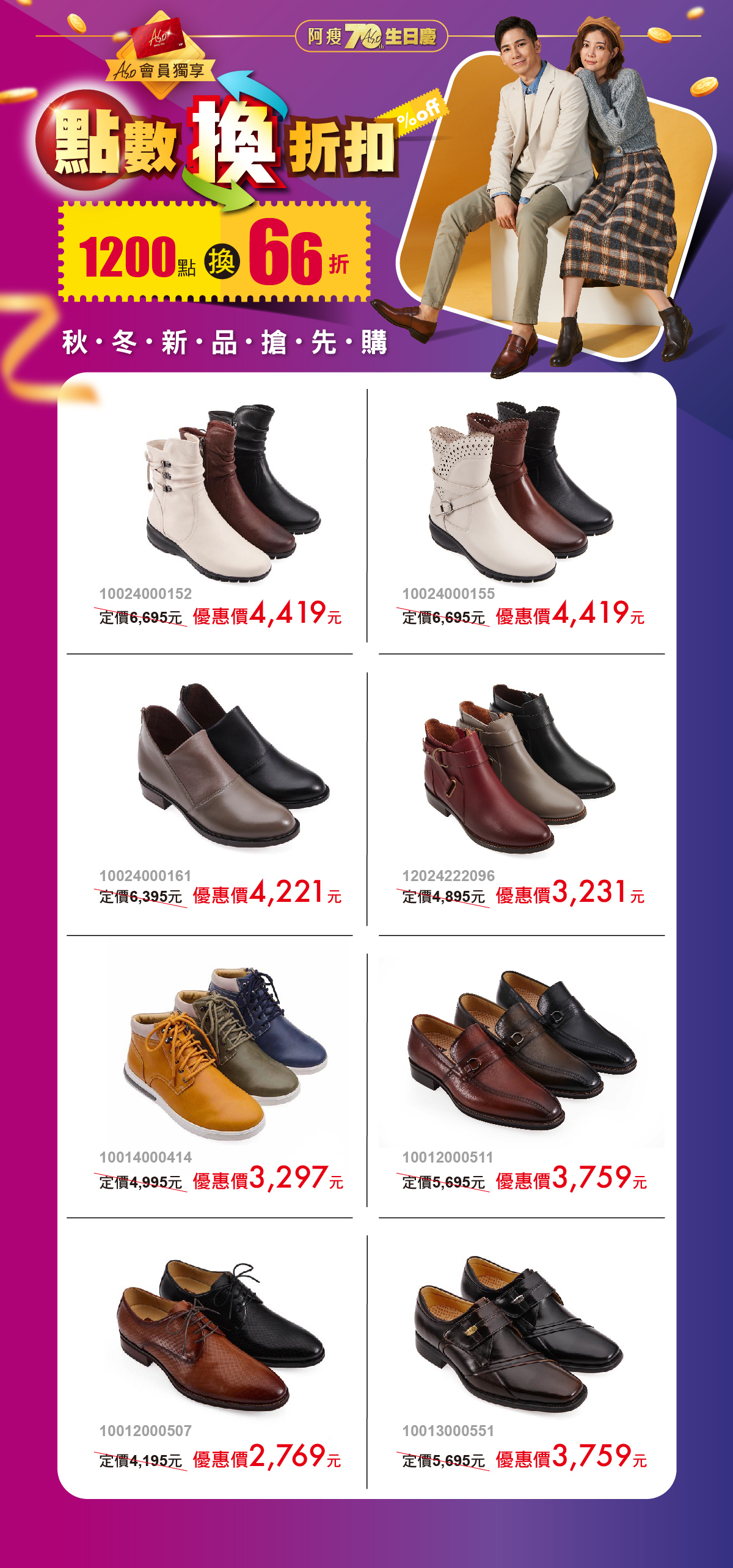 *每人限兌換一次,兌換後將扣除購有利1200點,本券限阿瘦全國門市 及 百貨專櫃使用。*單筆購買A.S.O、BESO 鞋/包,享定價*66折之優惠。*不得與套組或其他優惠合併使用。*如有未盡事宜,本公司保留解釋本券適用範疇及使用方式之權利。