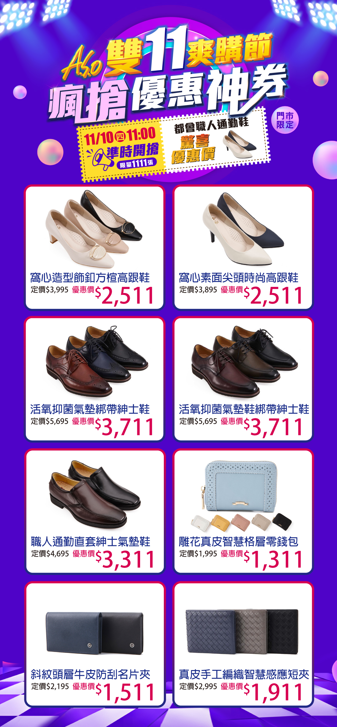 *每人限兌換一次,本券限阿瘦全國門市 及 百貨專櫃使用。*單筆購買限定都會職人通勤商品,享雙11專屬優惠價。*不得與套組或其他優惠合併使用。*如有未盡事宜,本公司保留解釋本券適用範疇及使用方式之權利。