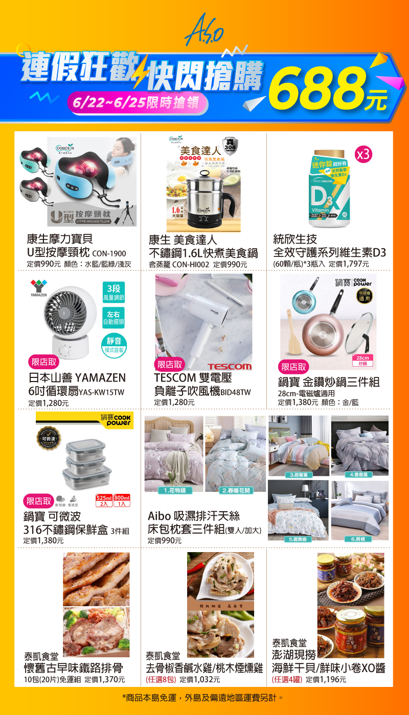 使用期間:即日起-2023/7/2(日),逾期失效不得使用。*每人限領一次。本券僅限阿瘦全國門市及實體購物中心使用。*憑本券購買指定商品,可享一件 $688元換購優惠價,限量商品售完為止。