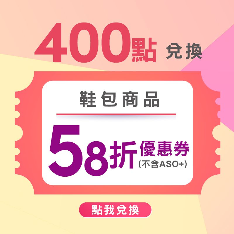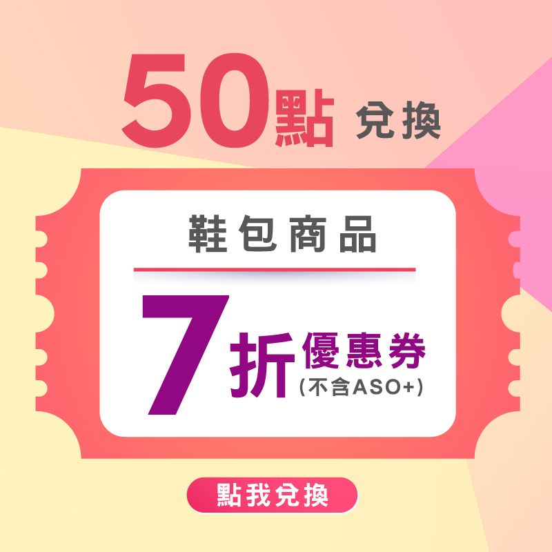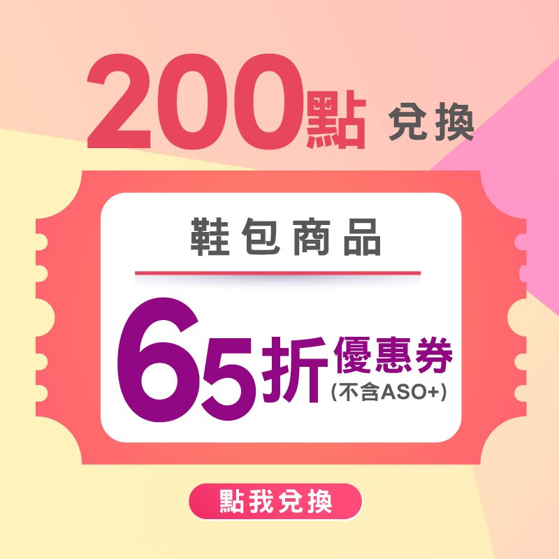 - 點數兌換【折扣券】:每位會員可兌換多張折扣券,每張折扣券限購買A.S.O/BESO自有鞋包商品(不包含ASO+商品)一件,且不可與其他門市優惠活動併用。