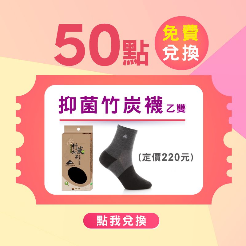 - 免費商品與折扣券可同時兌換:例如:A會員擁有450點,可用50點兌換竹炭襪x1、100點兌換7折券x2、200點兌換65折券x1。