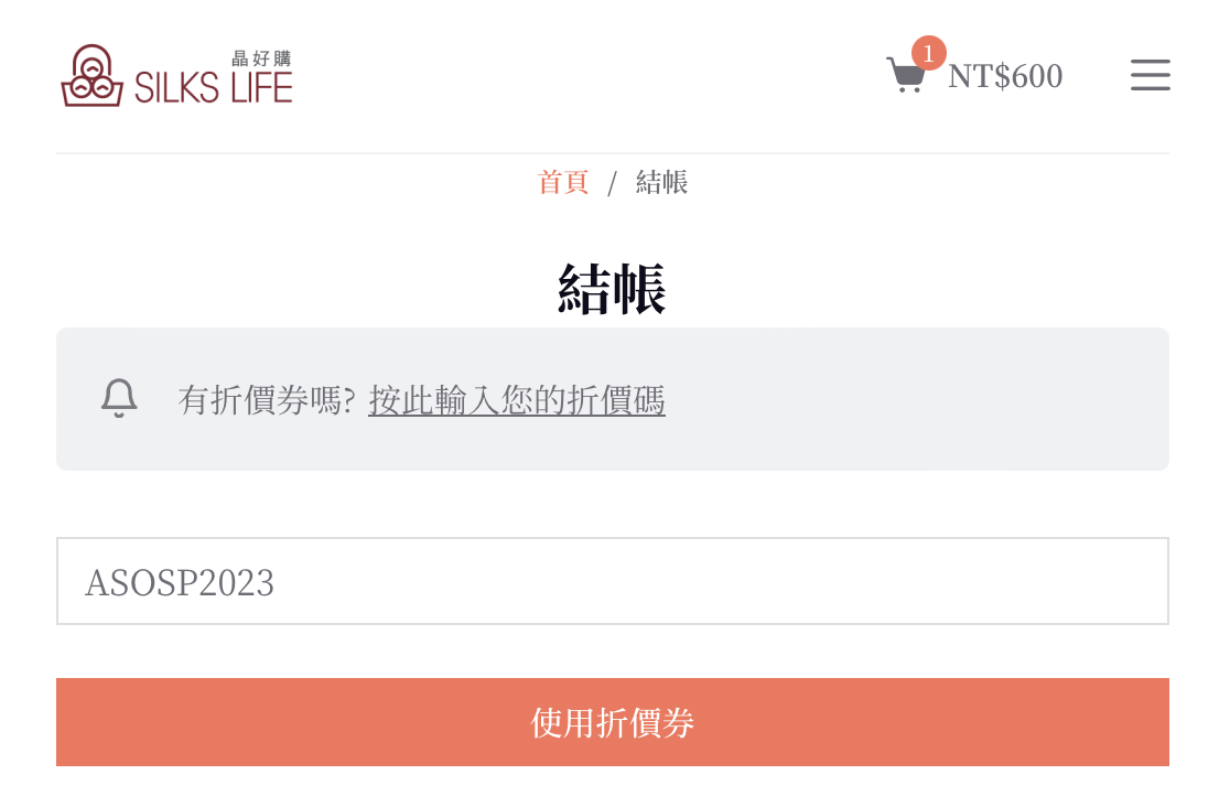 • 台南晶英酒店全方位飯店選物所「晶好購」https://silkslife.com,結帳頁面輸入「ASOSP2023」,全館滿千折百購物金(無法累計),每人限使用乙次優惠,使用期限至2023/9/30止。
