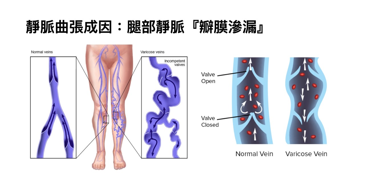 足靜脈疾病最常見的,就是靜脈曲張。靜脈曲張最主要的成因,是腿部靜脈瓣膜滲漏,原本應回流至心臟的血液因瓣膜閉鎖不權而逆流,囤積在靜脈導致血管變型。很多人覺得靜脈曲張只是影響美觀而已,但其實若不去改善或治療,嚴重的靜脈曲張很可能導致皮膚色素沉澱、下肢水腫、甚至傷口潰爛。