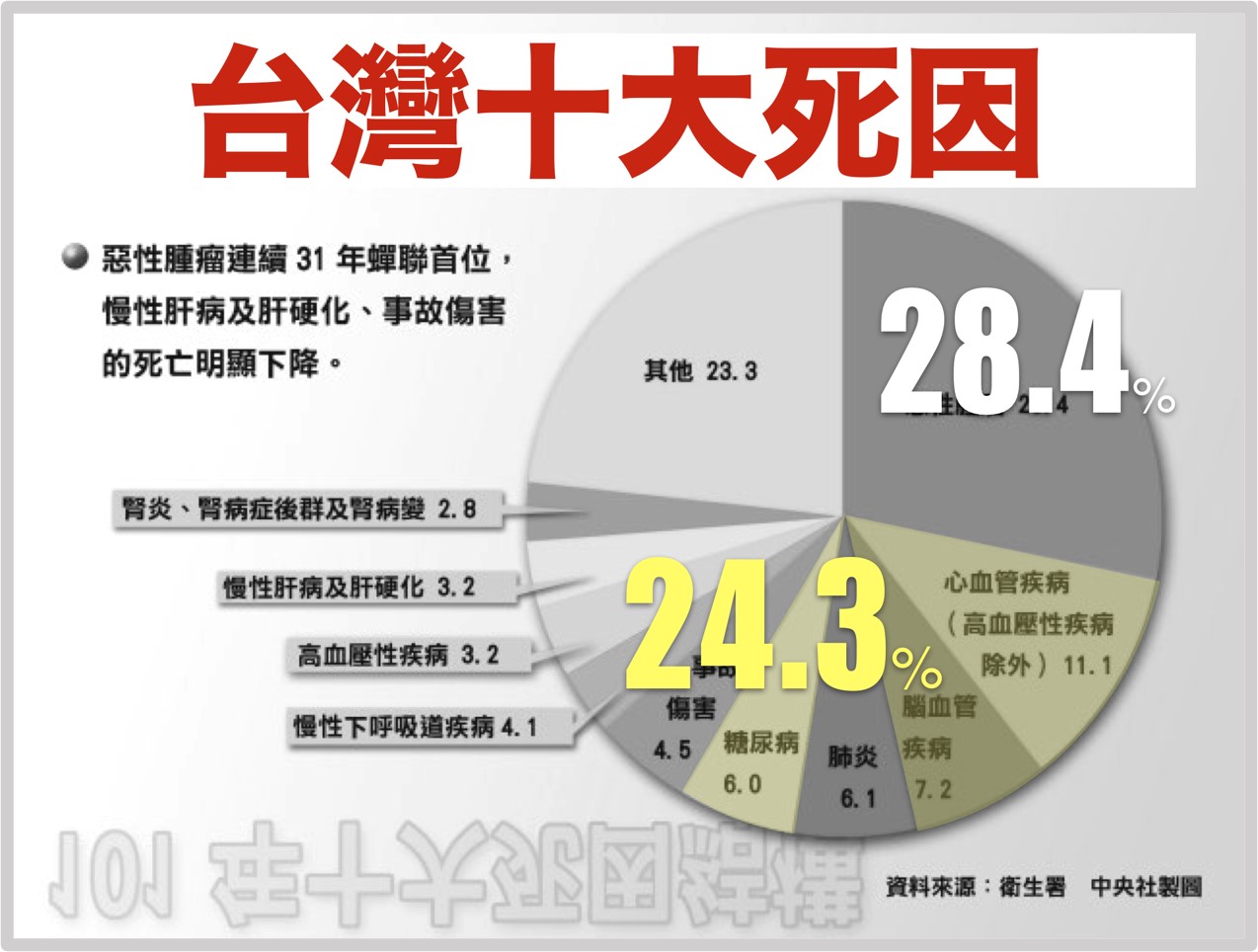 台灣十大死因如大家所知,幾十年來都是惡性腫瘤蟬聯首位,第二位就是心血管疾病。而十大死因中,與「動脈硬化」相關的疾病,佔了24.3%,緊逼惡性腫瘤。