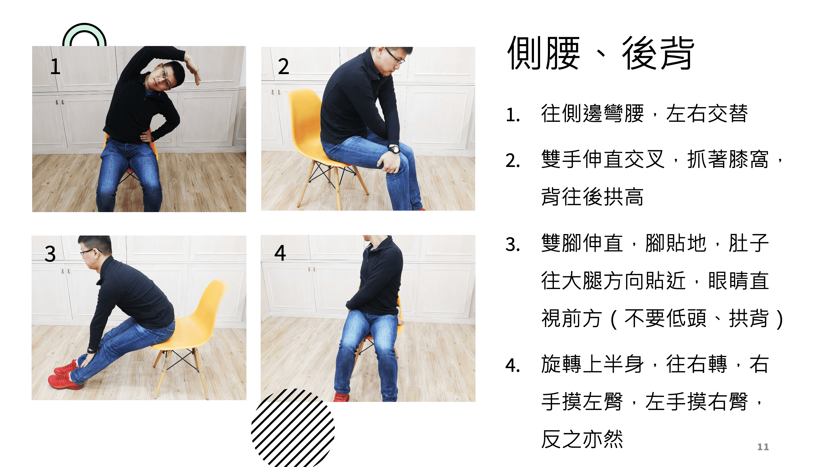 每個動作數 15 下,左右重複至少兩次,可視自己的身體狀況而定。