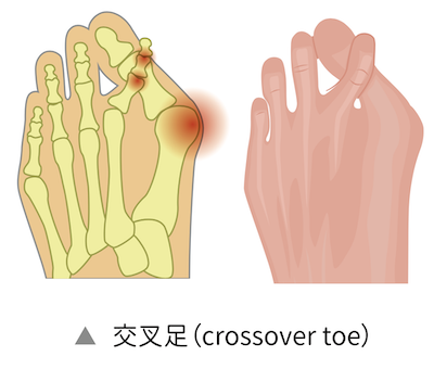 對於拇趾外翻的患者而言,最主要的不適感通常表現在穿鞋時。正常情況下,腳的第一趾與第五趾會大致呈現平行,而一雙合腳的鞋穿起來不至於引起過多疼痛或不適。然而,對於拇趾外翻的患者來說,由於前足蹠骨往內側偏移,大腳趾向外偏移,嚴重者甚至可能出現趾頭交叉的情況(大腳趾藏到第二第三的腳趾頭下方),形成所謂的交叉足(crossover toe)。這種變形不僅造成腳趾間的摩擦不適,甚至可能導致皮膚發紅、破損。嚴重情況下,在因拇指外翻導致前足變寬後,第二、第三趾的腳底會因摩擦形成雞眼,導致在穿鞋行走時感到極度的不適。