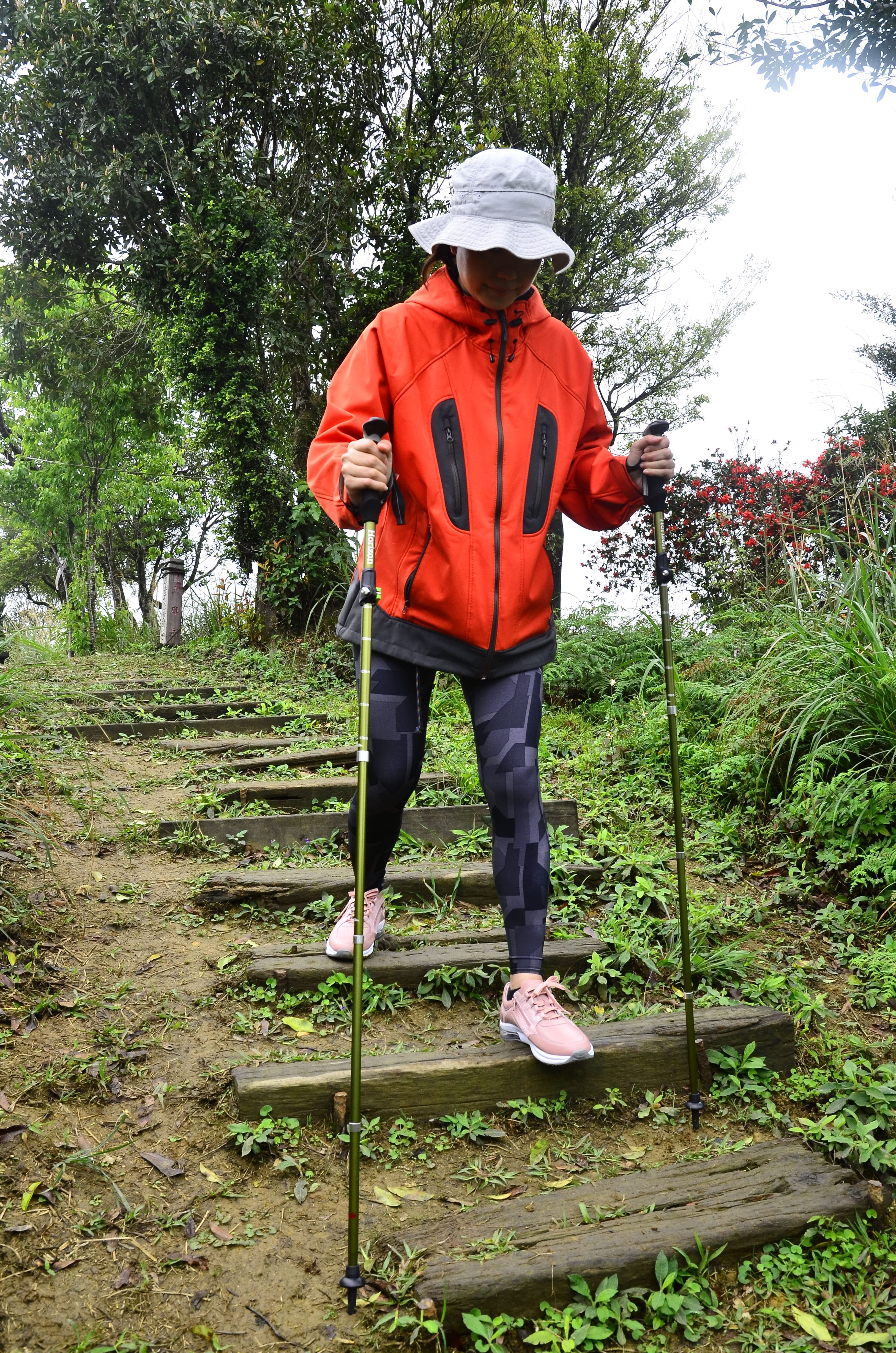 需注意登山杖只能作為輔助支撐,千萬不能把重心全壓在登山杖上,避免登山杖斷裂而失去平衡。