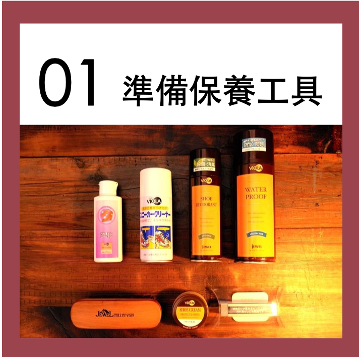 本次示範的皮鞋清潔保養流程,使用工具有:
