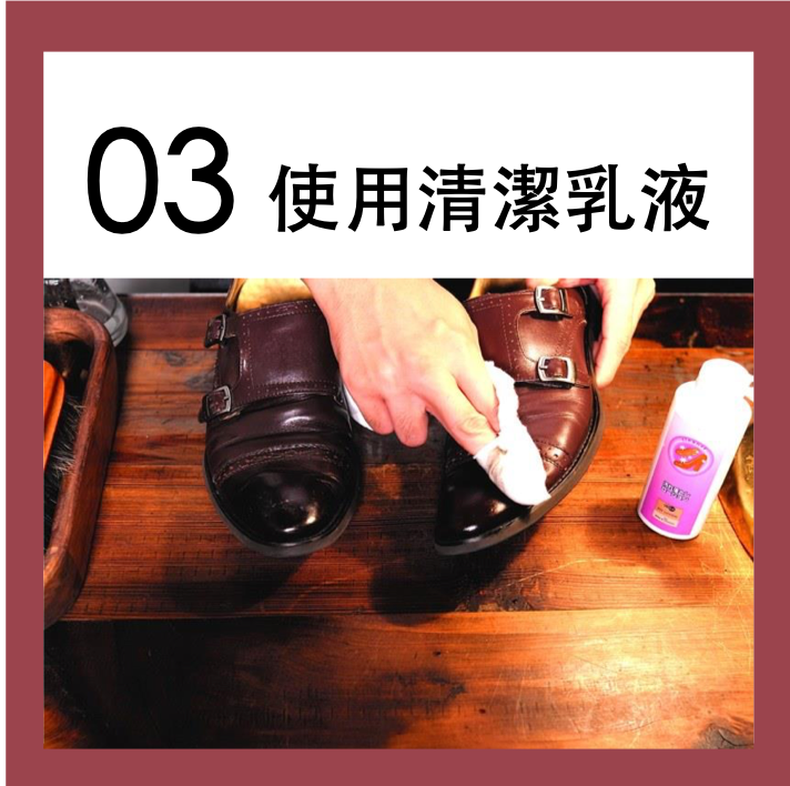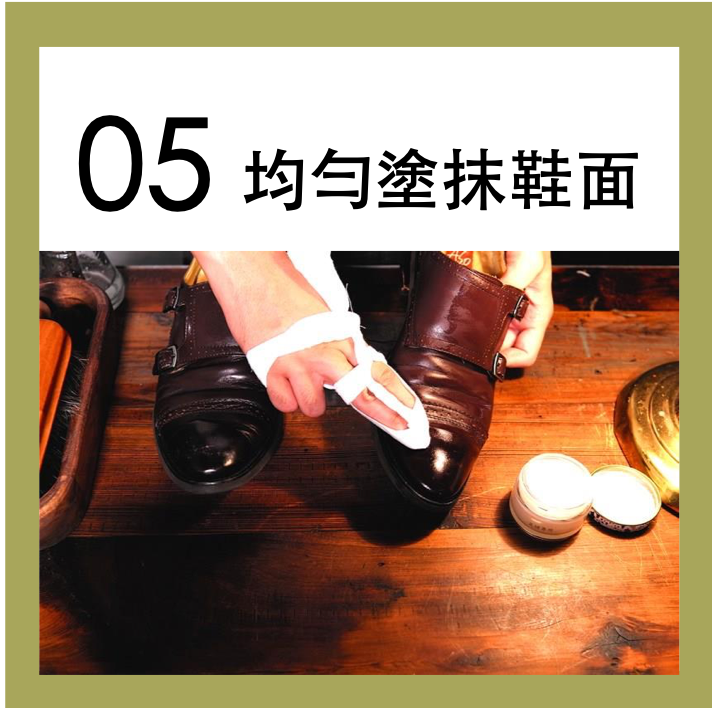 將保養乳均勻塗抹至皮鞋每一個皮面,徹底滋潤、補充皮革油脂,防止乾裂。